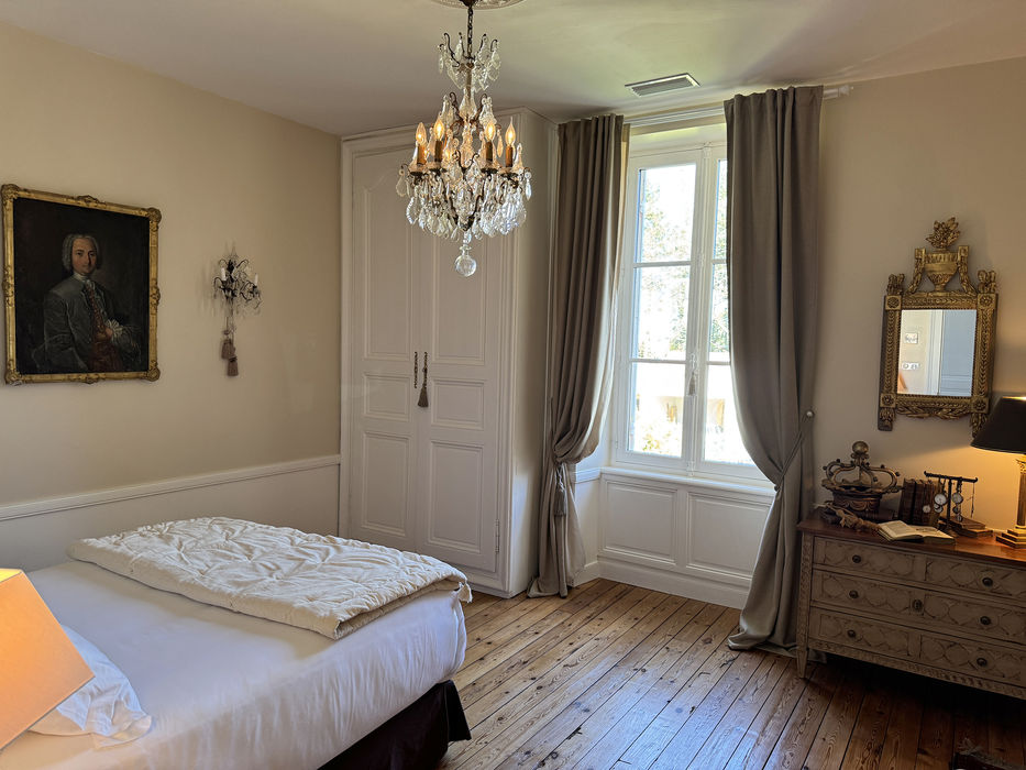 ... dans la Chambre de Monsieur, aux notes intemporelles, située à droite au fond du couloir. Ouvrez la porte de cette chambre de 16,5m², à l’ambiance masculine, élégante et raffinée, décorée avec soin avec du mobilier d’époque, des lustres, des tableaux et des objets décoratifs, tout en offrant le confort moderne : climatisation, télévision et Wi-Fi.